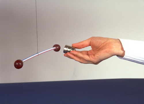 Почему при поднесении сильного магнита к виноградине, укреплённой на конце пластиковой трубочки, ягода отталкивается от магнита?